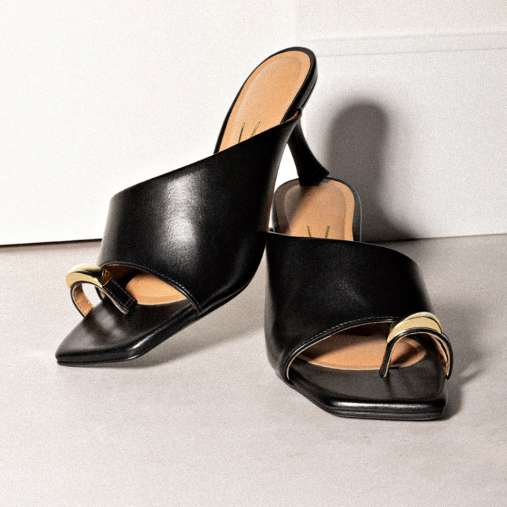 Minimal and versatile, this black napa mule is defined by clean lines and a softly matte finish. Set on a sculptural mid heel with restrained gold detailing, it’s designed as a reliable, repeat-wear option across work and evening.