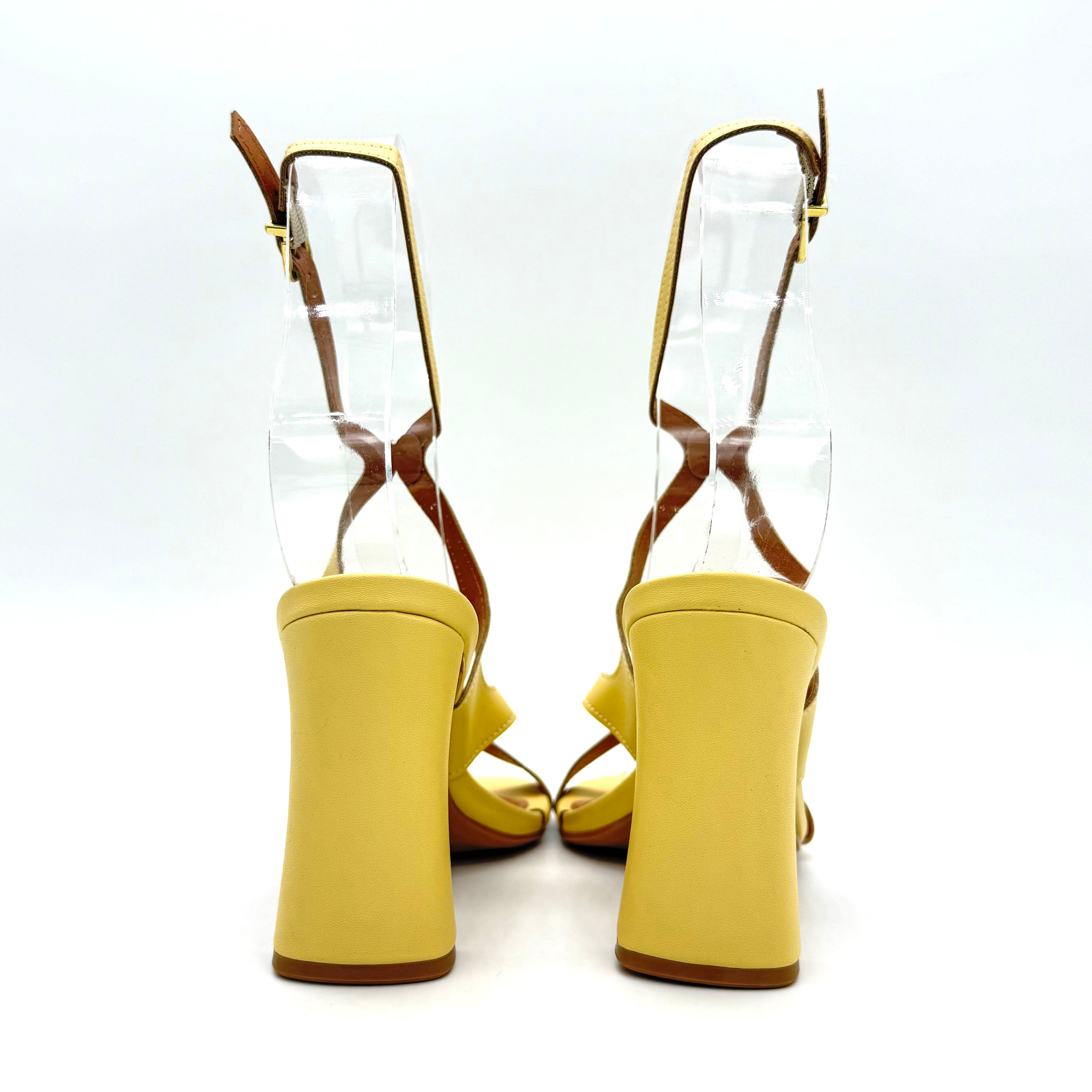 Soft, fresh and perfect for warm-weather styling. This butter yellow sandal features slim crossover straps and a sturdy block heel for balanced height and comfort.